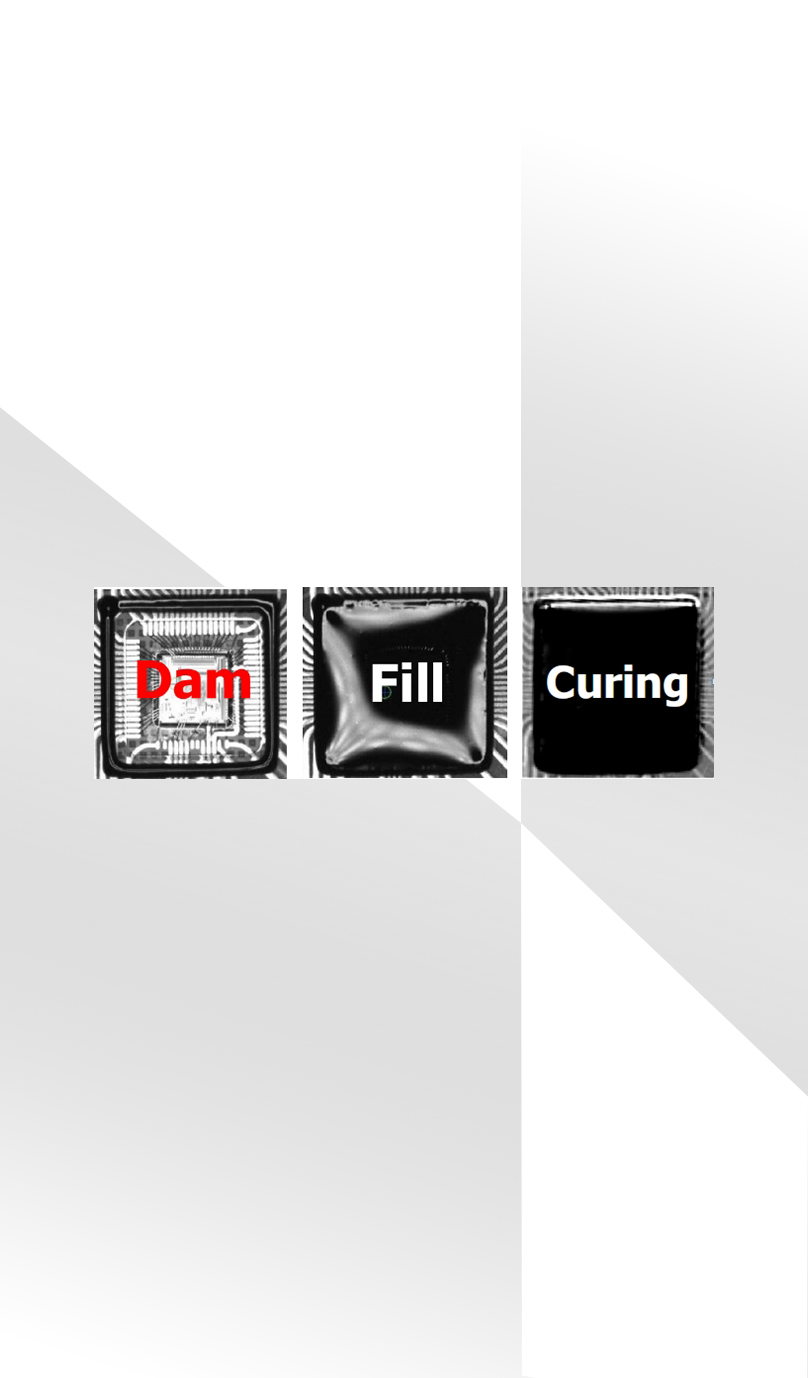 Fill工艺:使用低粘度胶水,一般用环氧类胶水,去包封住芯片及引线,从而保护半导体元器件,提升使用寿命,胶水粘度低,适合喷射,要求效率高,采用喷射点胶,可使用气动喷射阀或压电阀点胶。