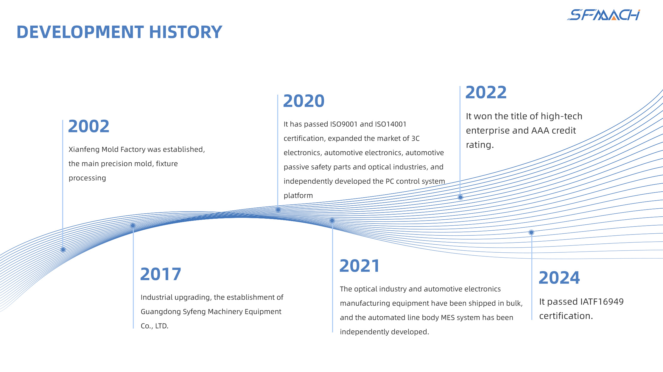 Guangdong Syfeng Machinery Equipment Co., Ltd. was established in 2002, with a registered capital of 10 million yuan, headquartered in Nancheng District, Dongguan City, the world's manufacturing center and innovation city, with an existing plant area of 5000 square meters, 80+ employees, and more than 25% of R&D personnel. It is a national specialized optical industry, 3C and automotive electronics, ICT&FCT&EOLtesting, MES whole line automation and intelligent equipment manufacturing. Company R & D, manufacturing, assembly, sales and service in one, automatic machine products and equipment OEM/ODM used in 3C electronics, automotive electronics, optical industry and other fields, through the ISO9001, ISO14001, IATF16949 quality and environmental management system certification, a total of more than 30 patent technology applications.